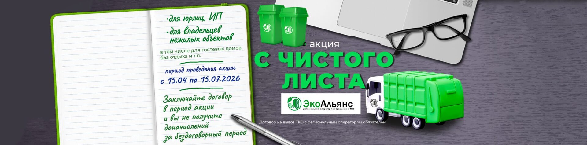 Экологическая ответственность становится неотъемлемой частью успешного бизнеса. Акция «С чистого листа» — это уникальная возможность для владельцев нежилых помещений привести в порядок все документы, связанные с обращением с твердыми коммунальными отходами (ТКО).
