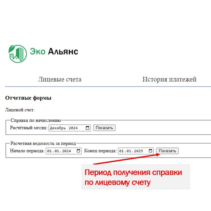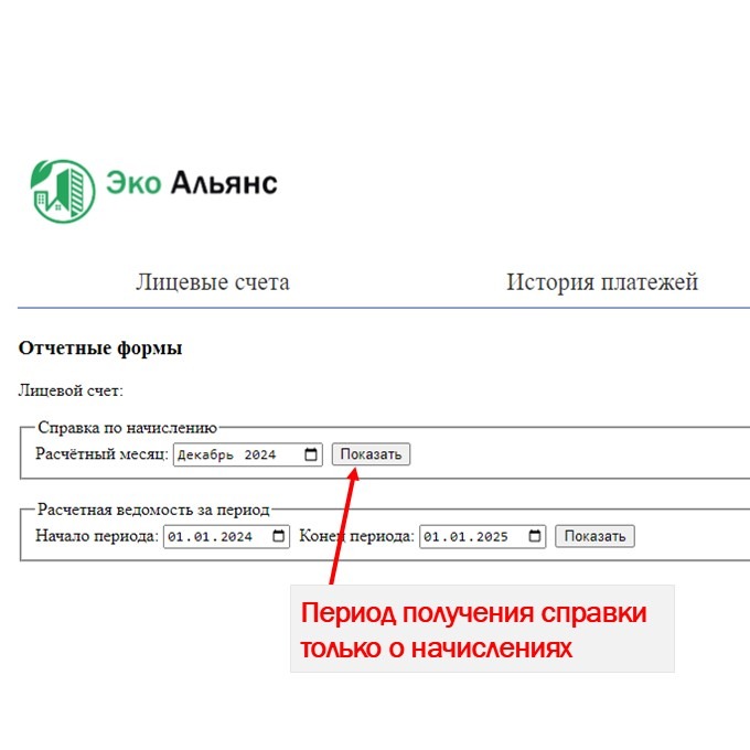 «Справка по начислению» за период для произведения оплаты за услугу по вывозу ТКО