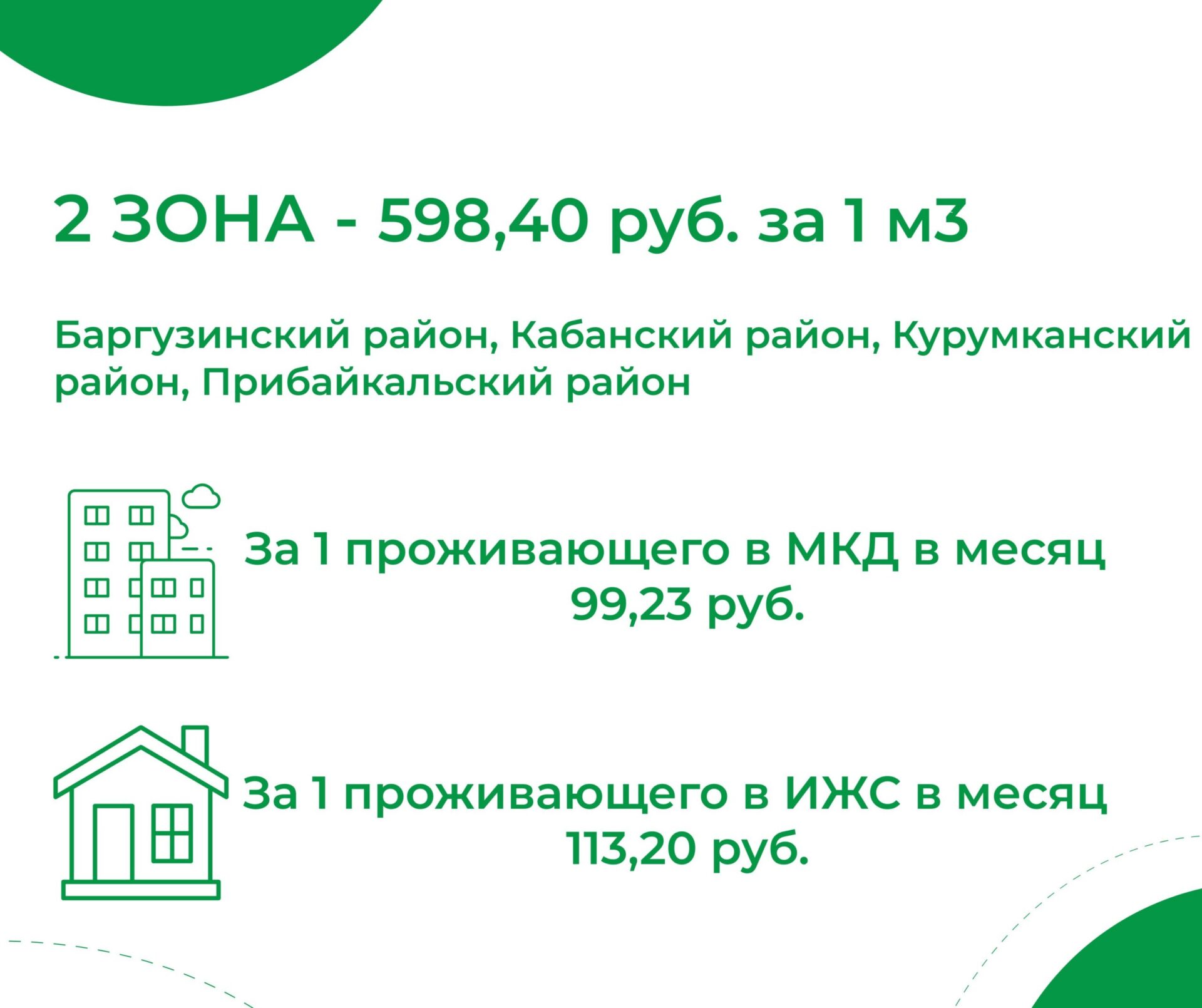 К 1 зоне относятся г. Улан-Удэ, МО «Иволгинский район», МО «Тарбагатайский район», МО «Бичурский район», МО «Мухоршибирский район», МО «Окинский район», МО «Тункинский район», ГО «г. Северобайкальск», МО «Северо-Байкальский район», МО «Муйский район», МО «Баунтовский эвенкийский район», МО «Еравнинский район», МО «Кижингинский район», МО «Хоринский район», МО «Заиграевский район».